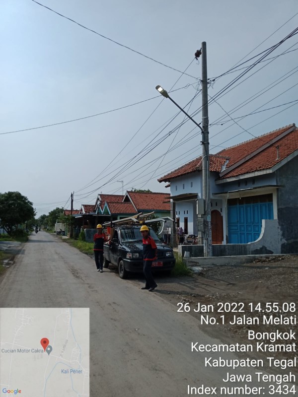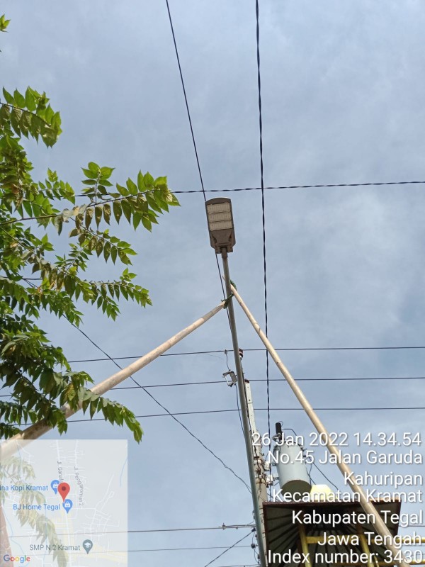 | Isi Laporan | : | Lampu PJU di Ruas Jl. Garuda, Desa Bongkok, RT 06 RW 03 Kec. Kramat Kab. Tegal kondisinya MATI. Total Lampu Mati ada 2 Unit. 1 Unit Lampu sebenarnya sudah mati hampir 1 Tahun (sejak dipasang). Tapi tidak ada penanganan. Ini nambah 1 PJU lagi yang mati. Lokasi ada di Sebelah Selatan Dealer Astra Bongkok (20 Meter). Mohon Untuk ditindaklanjuti. |